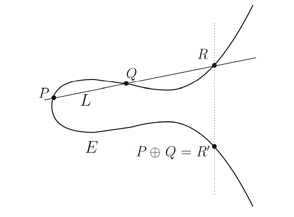 和我们通常理解的加法不同,这里的加法是在曲线上进行的,也就是说给出两个点,相加一定可以得到椭圆曲线上的第三个点R',这个点就是加法的结果。